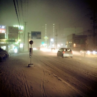 仕事帰り、新国道のバス停で、暴風雪の中、帰りのバスを待つ。