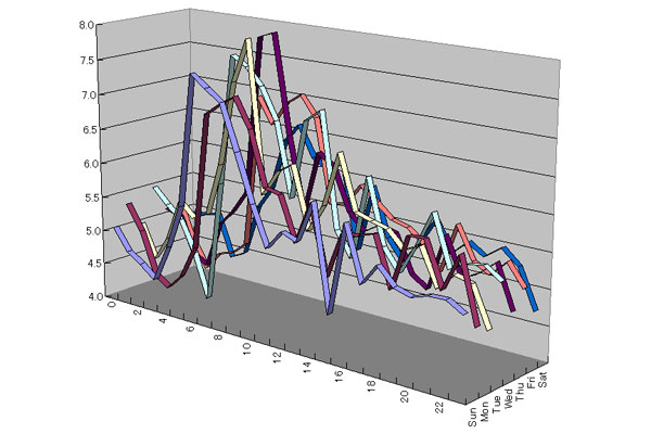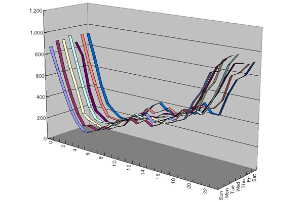 それらすべてを曜日毎・時刻毎にクロス集計したものが下の表になります。