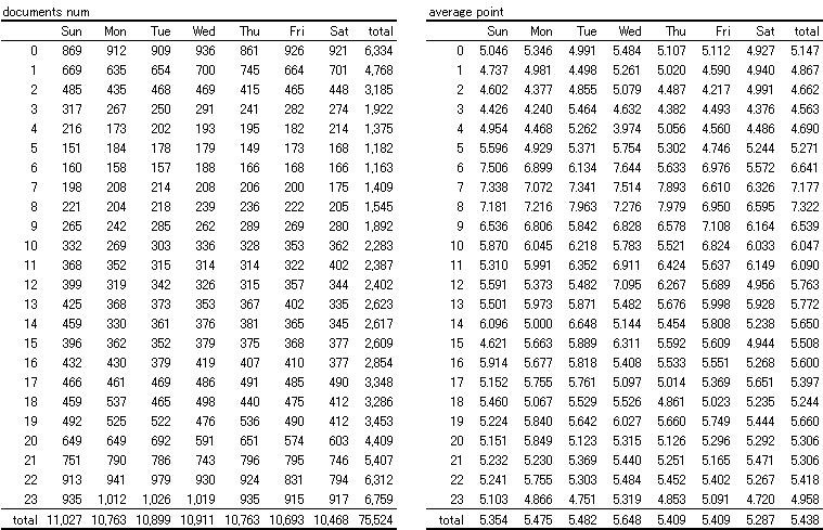 左の表が投稿作品数、右の表が1作品あたりの獲得ポイント数です。