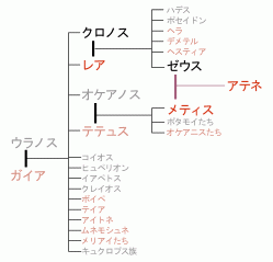アテネについて。アテネは多様な性質を持つ神であるが、ギリシャの英雄たちをよく鼓舞し守護した。ヘラクレスの試練を助け、ペルセウスのゴルゴ―征服を支援し、ここではオデュッセウスと若いテレマコスを守っている。アテネの系図を示す。