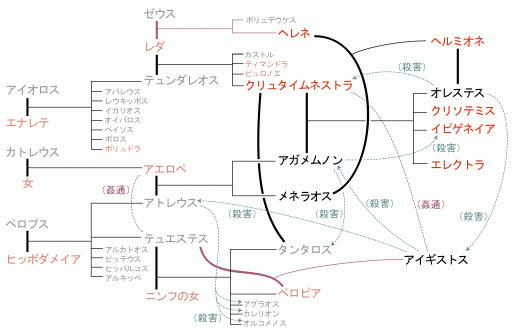 ノンの息子オレステスが姉のエレクトラの協力でアイギストスに復讐を果たすという題材は、アイスキュロス「オレステイア」などギリシャ悲劇であつかわれた。アガメムノンの系図を示す。