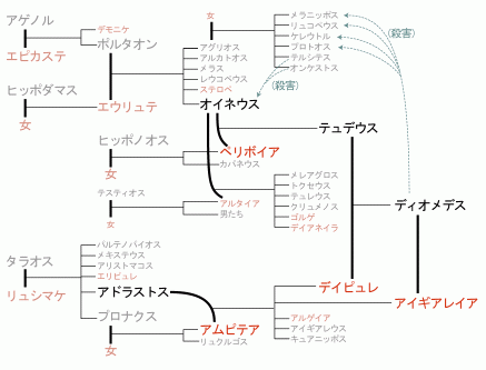 エピゴノイとはテーバイ攻め七将の息子たちのことで、エピゴーネン(模倣者)の語源である。ディオメデスの系図を示す。