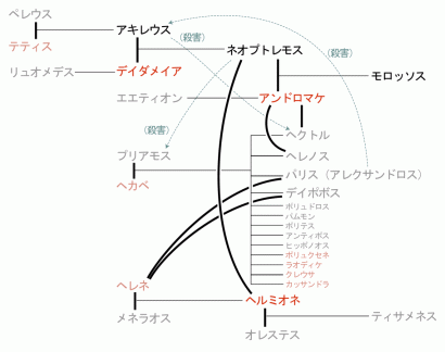 ラオスの娘ヘルミオネを娶るが、アガメムノンの息子オレステスに殺される。ネオプトレモスの系図を示す。