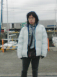 漁港と船が浮かび並ぶ景色を背に テトラポットに座り込み