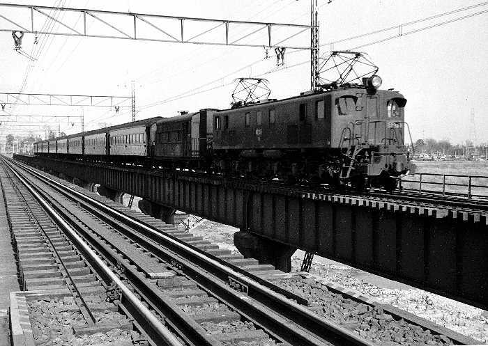1970年代初め、中央本線多摩川橋梁を行くスマートになったEF13型電気機関車。2両目の暖房車が2120型蒸気機関車改造のマヌ34型なのかは判別できませんが、恐らくそうではないだろうかと思っております。。