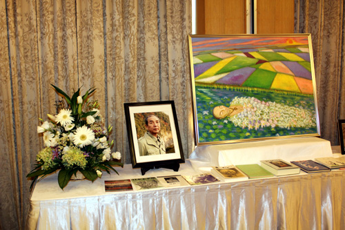 中央は奥様が描かれた絵が飾られています。お棺に納められた天彦さんのお顔ですね。花いっぱいです。