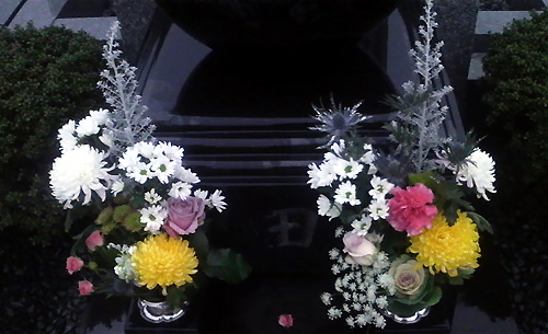 クリスマスが近いので、クリスマスっぽいお花を持って行きました。前にいらした方が、立派な大輪の菊の入ったお花を供えてくださっていて、小菊は枯れていたのですが、大輪菊は今が盛りとばかり咲いていましたので、一緒に花立てに入れさせていただきました。大輪の菊は、切り花にしても花期が長いんですね。