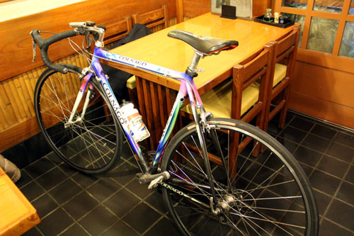 まもなくして、梵さんが登場! 江ノ島まで走ってきたと、お店に自転車ごと入店してきました。「盗まれると困るから」とのこと。「今日は高いタイヤをはいていないから150万はしない」自転車です。自転車で出掛けてどこかお店に入ろうとすると、ベンツをパーキングメーターに駐めるより、やっかいですね。