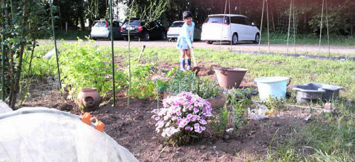 一番手前に、べにあずま(さつまいも)の苗を20本植えて、一カ所ネットが張ってあるのだけれど、そこの下に朝顔の種を蒔きました。