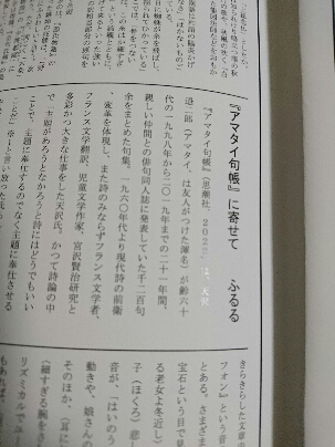 詩誌『阿吽通信』21号にて、天沢退二郎の句集『アマタイ句帳』についての文と詩を載せていただきました。天沢氏60代から80代までの、自由奔放なとても楽しい句集です。